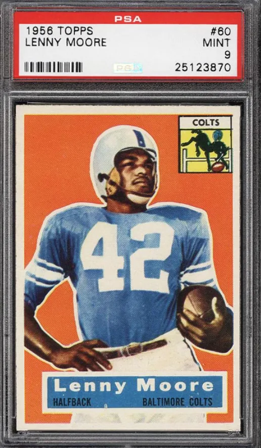 The record purchase of a 1956 set remains the No. 2 set in the PSA Registry (average grade: 8.764), purchased in 2021 for $37,934, according to Card Ladder, which tracks prices and card populations. For a single card record, a PSA 9 Stan Jones sold for $15,000 in 2016. That same year, a Lenny Moore in a PSA 9 (not perfectly centered) sold for $6,200.