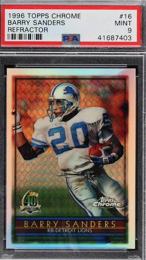 The record price paid for a single 1996 Topps Chrome Football Refractor is $1,147 for a raw (ungraded) Barry Sanders in March of 2026, according to Card Ladder, which tracks card values and populations.