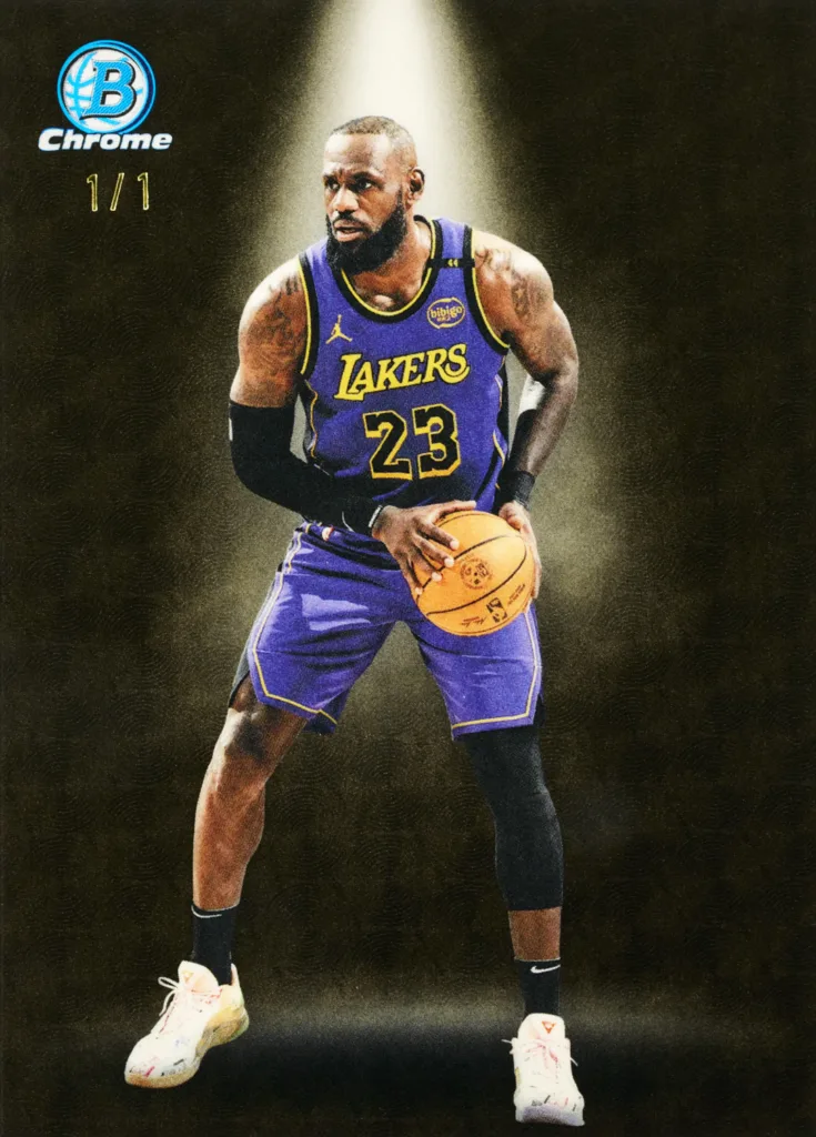 Another Hobby darling, Spotlights comes to 2025-26 Bowman Basketball with a selection of the best superstars, NBA rookies, and college talents. The King is here to be chased, alongside rising stars like Cooper Flagg and Victor Wembanyama.