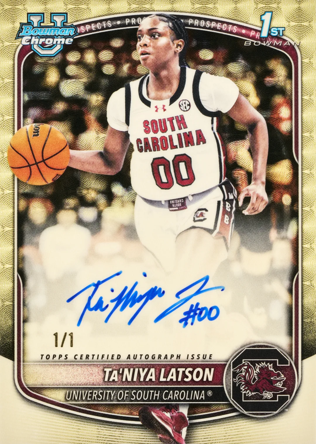 The inscription auto chase is also found on coveted Superfractor auto cards, including UNC’s Caleb Wilson and Ta’Niya Latson of South Carolina.
