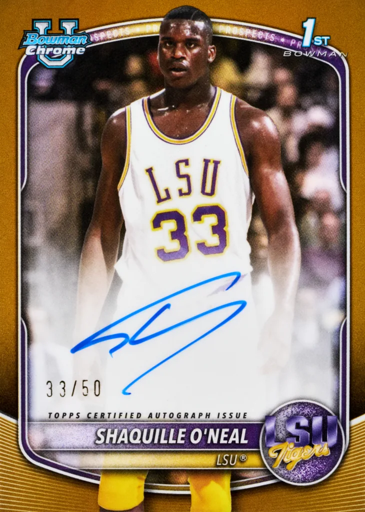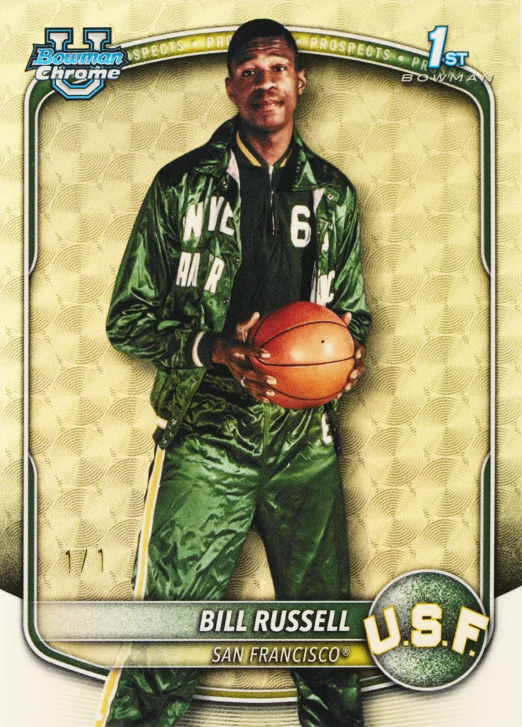 Old-school collectors can go retro in 2025-26 Bowman Basketball with a pair of incredible throwback cards for two of the game’s most dominant big men. Bill Russell and Shaquille O’Neal provide an exciting chase for fans who love both stylish cards and the history of the game.