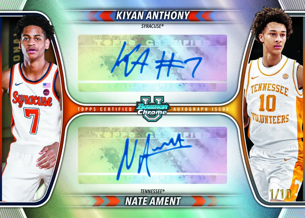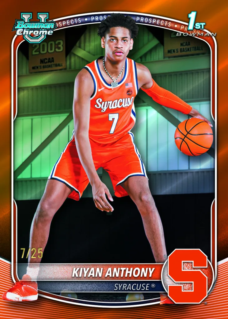 Two stars on the rise, spectacularly matched to the iconic colors of their schools, are Darryn Peterson in Jayhawk Blue, and Kiyan Anthony in Syracuse Orange. The combination of rarity and look make these special cards for fans of both the players and their schools.
