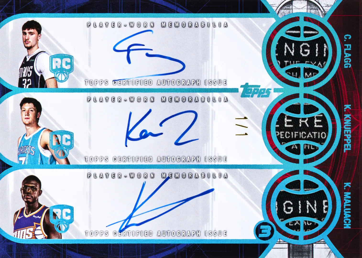 2025-26 Topps Three Basketball Triple Relics Autographs #TRA-CKK Cooper Flagg/Kon Knueppel/Khaman Maluach