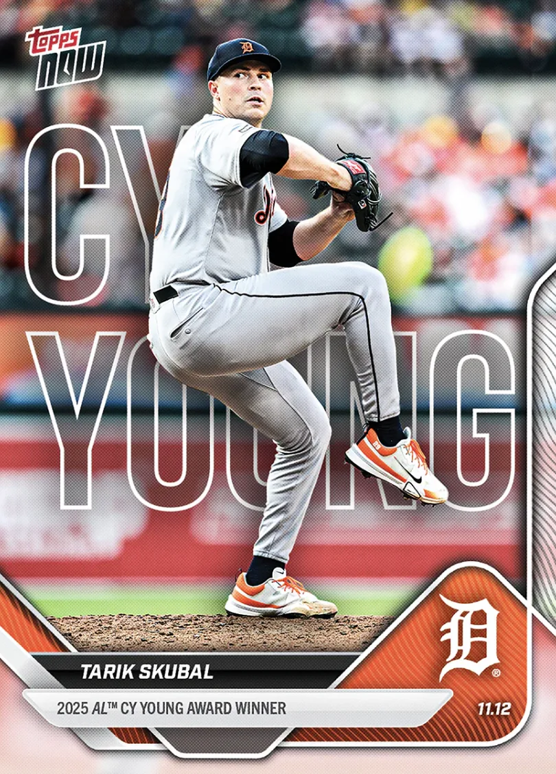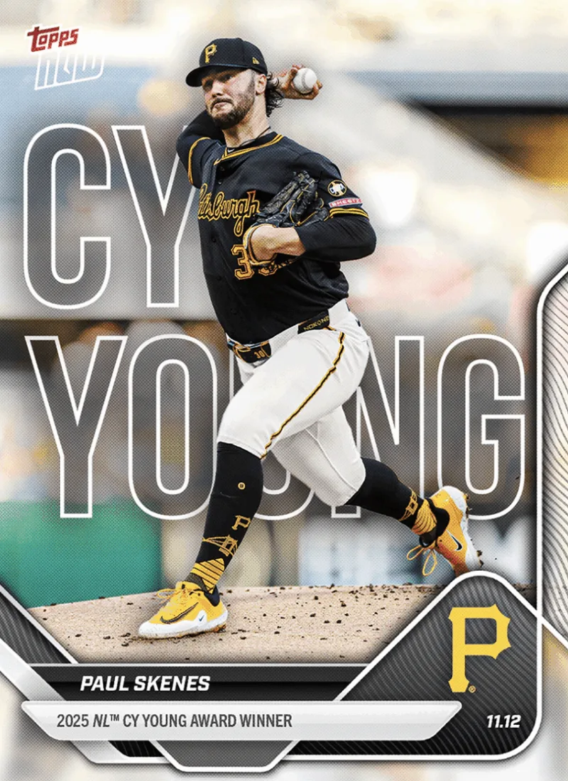 Paul Skenes (NL) and Tarik Skubal (AL) are the 2025 MLB Cy Young Award winners. Top chase cards include Topps NOW® #OS-4 (Skenes) and #OS-5 (Skubal), Topps Series 1 #98 (Skenes) and #71 (Skubal), and Topps Chrome #F15-8 (Skenes), and #90 (Skubal) — each offering distinct collector appeal.
