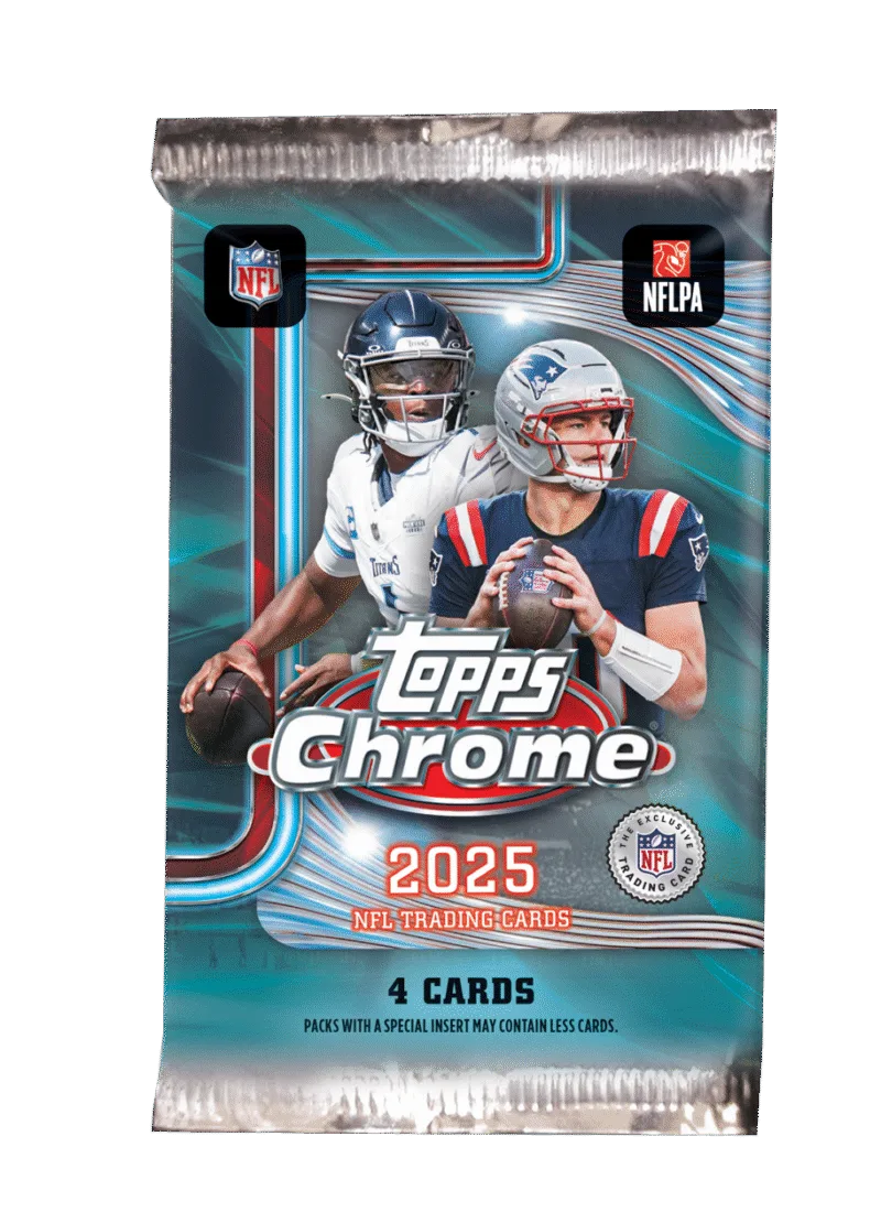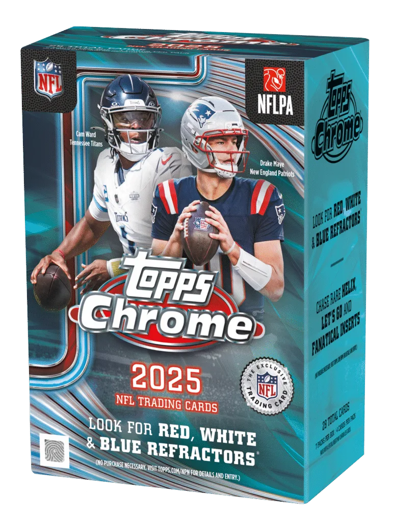 2025 Topps Chrome Football marks the product’s return after a decade, featuring Cam Ward and Drake Maye as cover athletes. The release highlights rising NFL stars at peak relevance, blending Chrome’s iconic design with modern energy, and reconnecting collectors with one of The Hobby’s most influential football card brands.