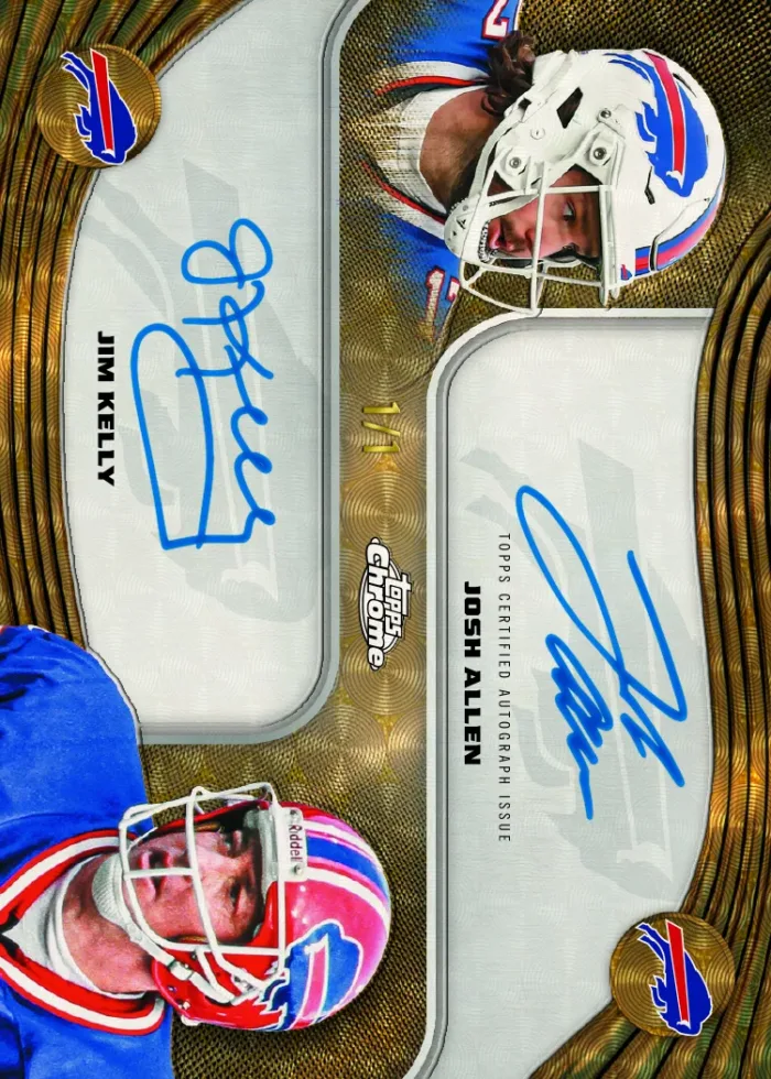Allen is positioned to go down as the best player in franchise history. The 2024 MVP will have incredible chase cards in the new release of 2025 Topps Chrome Football, including the rare Gold Shield relic auto cards celebrating the MVP season.