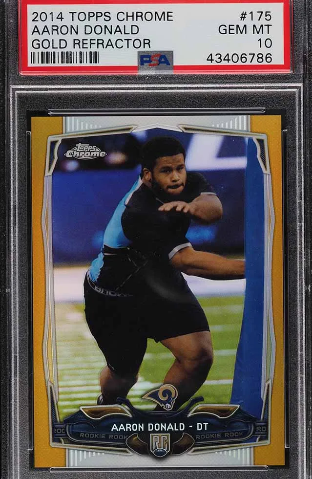 One of the best defenders in the history of the NFL, Donald is an absolute force at defensive tackle. he led the Rams defense as the franchise rose to the top, eventually winning Super Bowl LVI. Donald’s 2014 Topps Chrome RC Superfractor sold for almost $7,000 in March 2026.