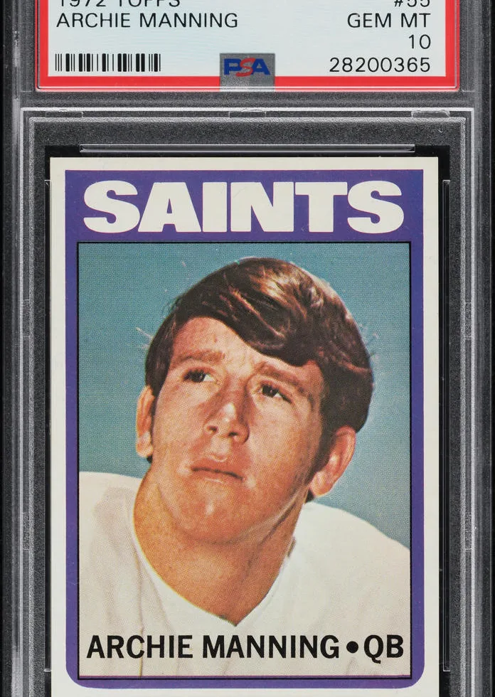 The patriarch of the NFL’s royal family, Archie is revered in New Orleans. The charismatic quarterback was appointment viewing in the Big Easy. His 1972 Topps RC is one of many fun vintage options of the legendary signal-caller.