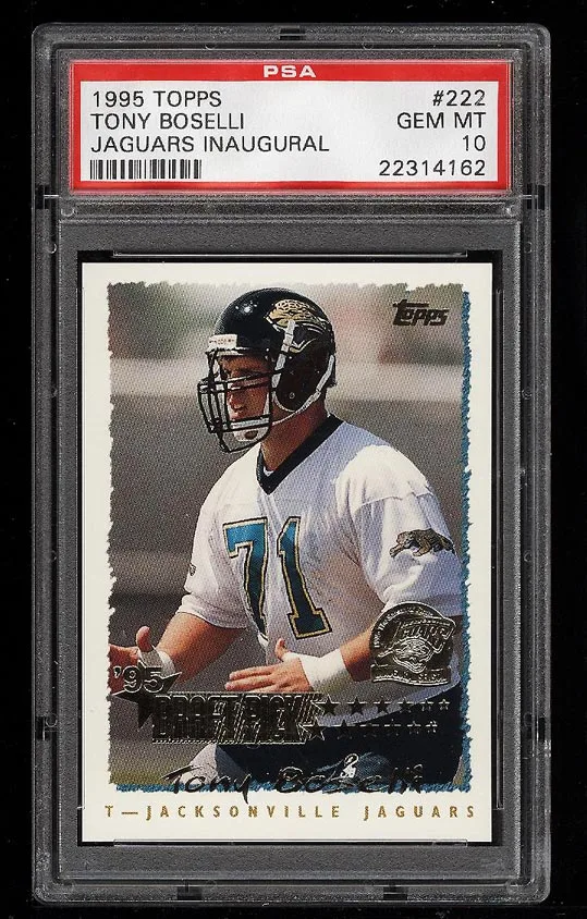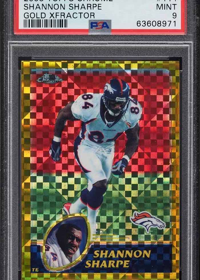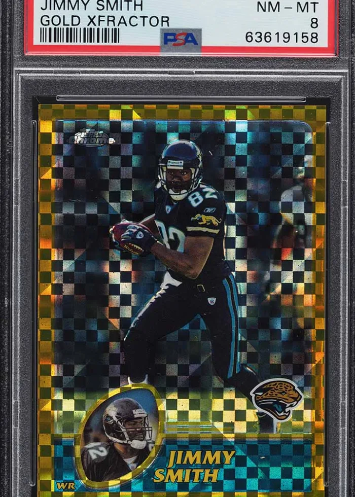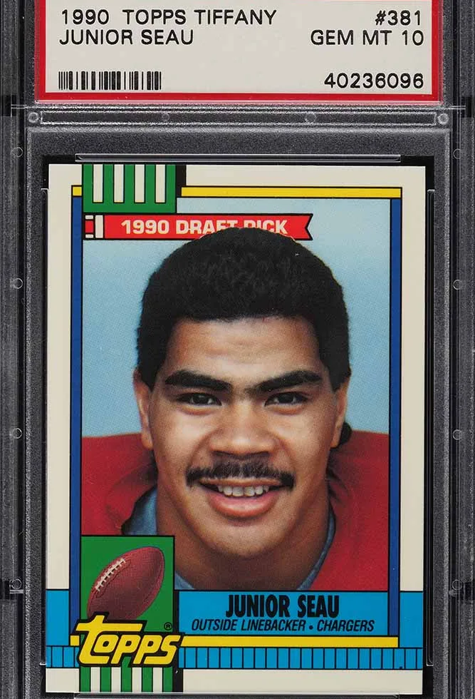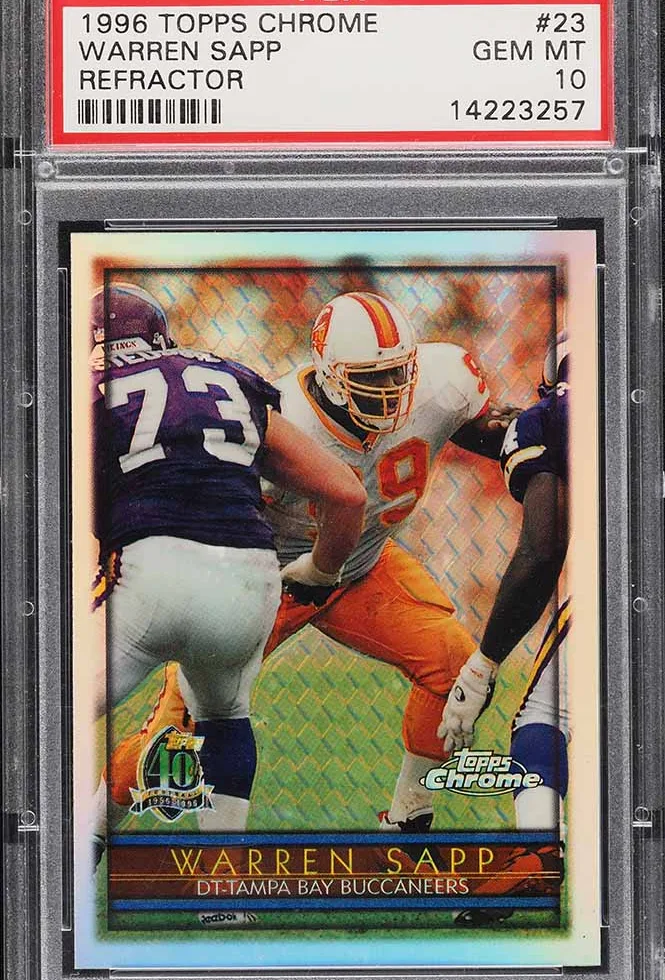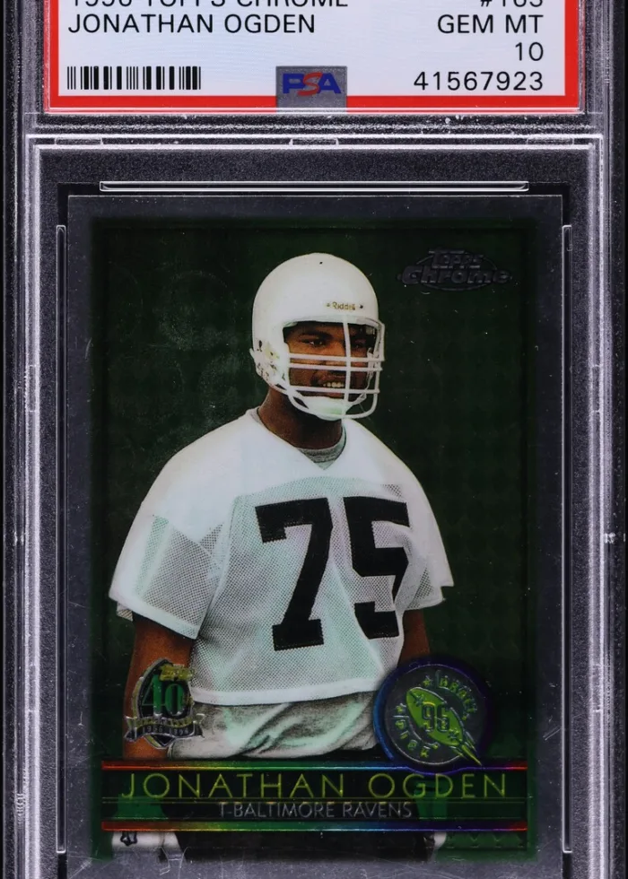 With 11 straight Pro Bowls, and nine All-Pro selections, Ogden was a dominant offensive lineman, anchoring the Ravens for over a decade. A Pro and College Football Hall of Famer, Ogden’s most valuable Topps card is his 1996 Topps Chrome Football RC.