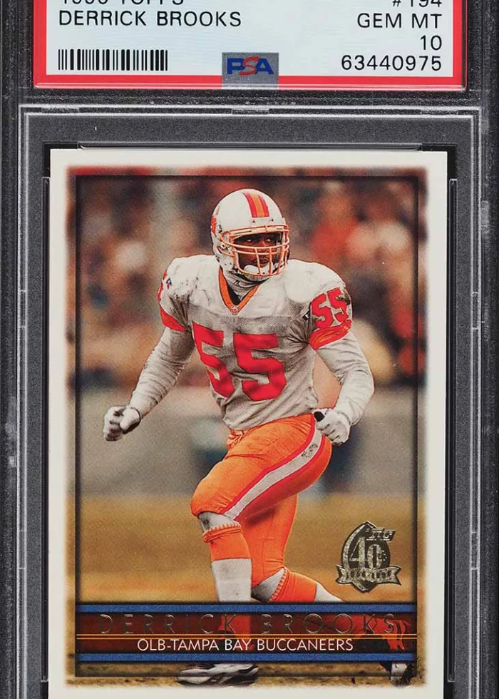 Brooks won a DPOTY himself during that Super Bowl season, forming an all-time duo with Sapp. A fearsome linebacker, Brooks was a nine-time All-Pro selection and is both a college and pro Hall of Famer. His 1996 Topps Football card features Brooks in the popular vintage Bucs uniform.
