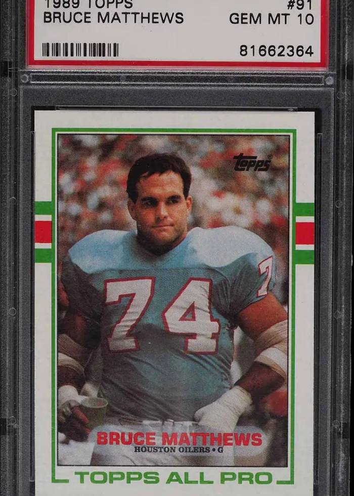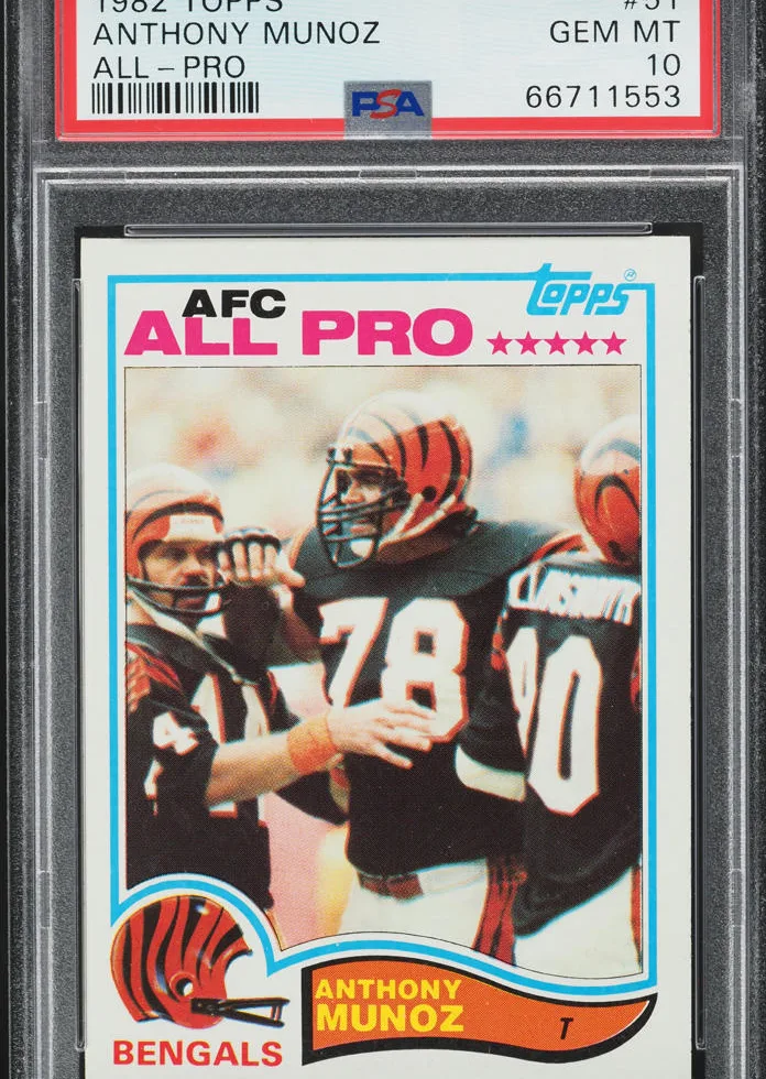 Muñoz received 11 All-Pro sections (including nine first-team nods) in only 13 seasons played. He was such a dominant force on the offensive line, that he even received a vote for Offensive Player of the Year in 1981, the year his quarterback Ken Anderson took home the honor. His 1982 Topps RC already honors him as an All-Pro — a fitting first card for a player who would stay on top for a over a decade.