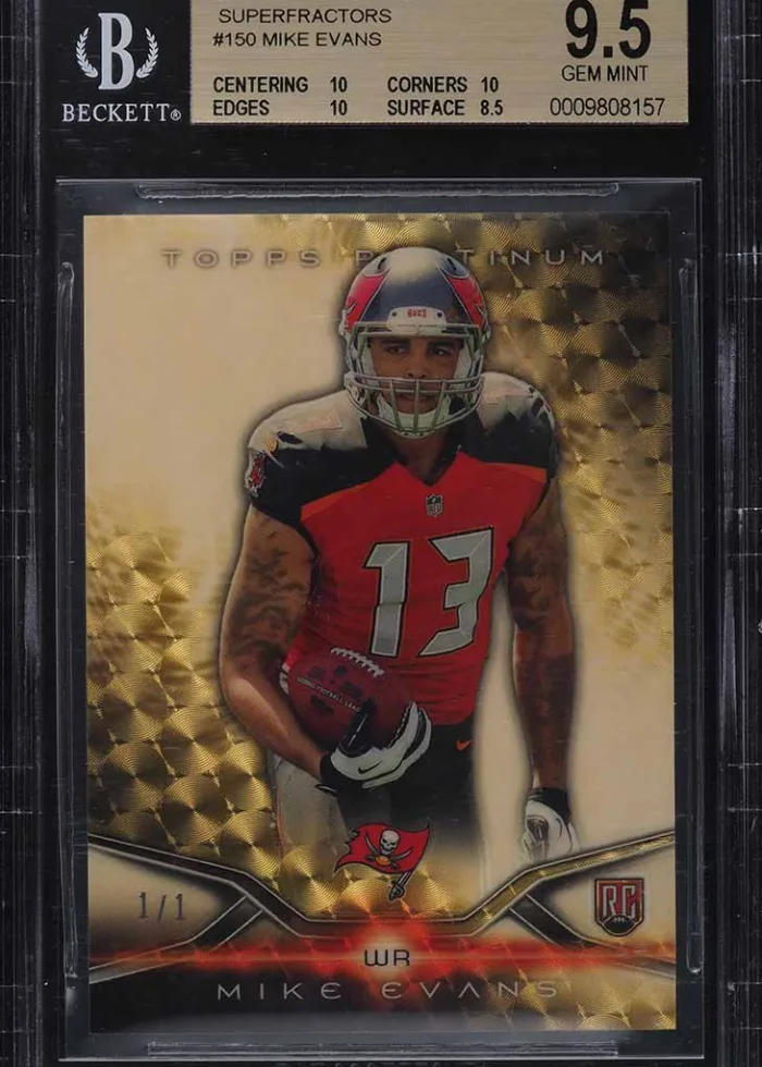 The greatest wideout in franchise history, Evans teamed with Tom Brady to bring a title back to Tampa. marking over 1,000 yards in his first eleven seasons in the league, Evans is a franchise legend. His 2014 Topps Platinum Superfractor sold for $3,000 in 2020.