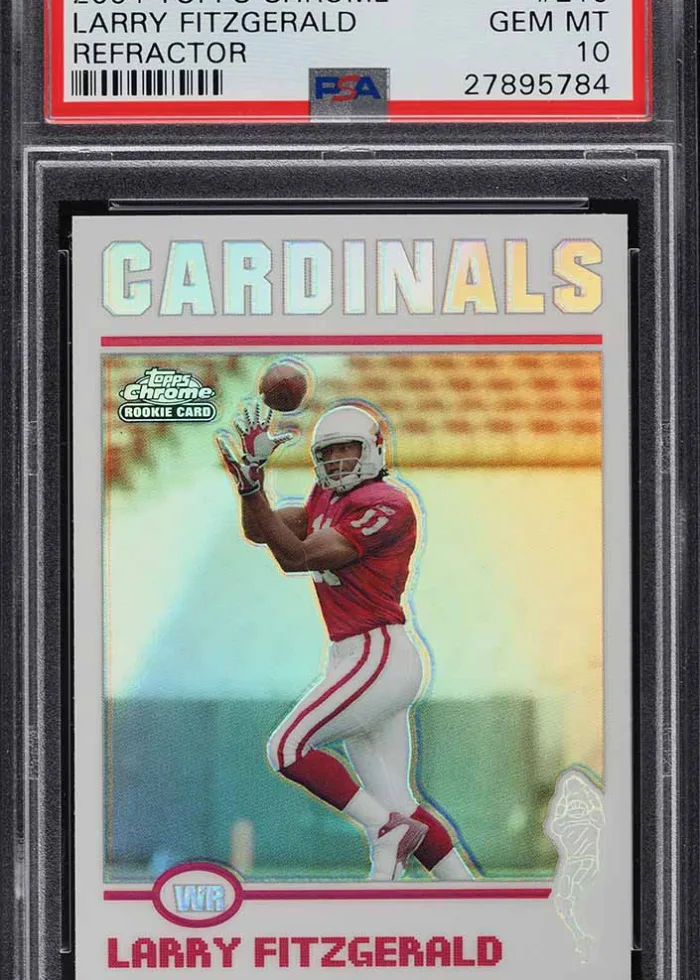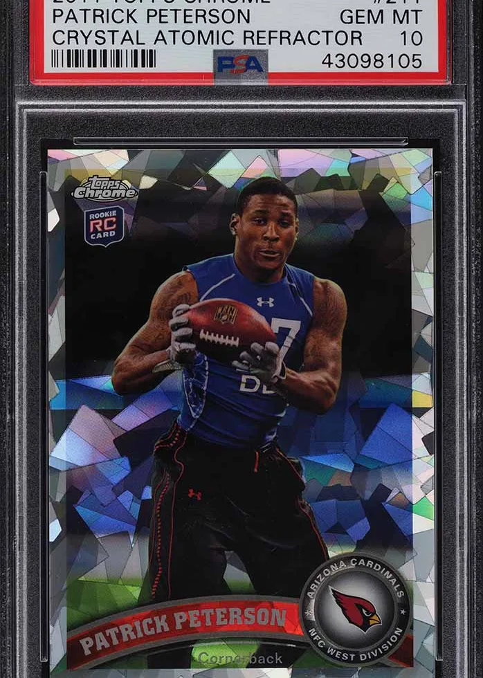 Three-time first-team All-Pro in a five year span, Peterson made eight straight Pro Bowls in his first eight seasons with the franchise. One of the best athletes in the history of the Cardinals was a phenomenal cornerback and electric in the return game. His 2011 Topps Chrome Atomic Refractor pops out of the hand.