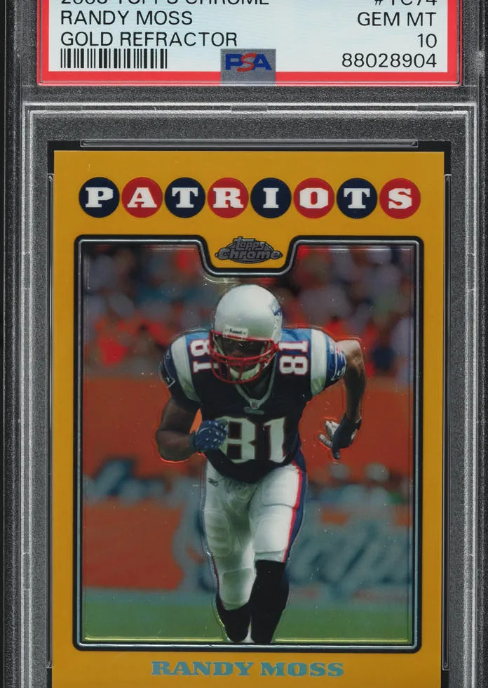 Moss is perhaps the most talented wide receiver in league history. At times simply impossible to cover, he holds the single-season receiving touchdown record, with 23 scores in an undefeated regular season to remember in New England. His 2008 Topps Chrome card is an excellent addition to a Pats collection.