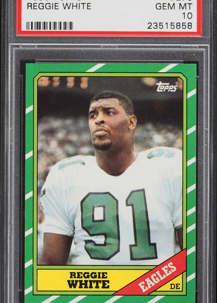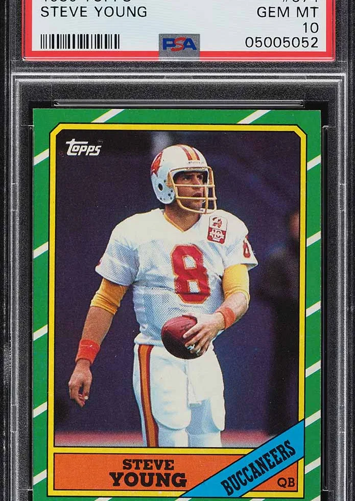 Starting in Montana’s shadow, Young emerged to put together a Hall of Fame career all his own. A two-time MVP, he led the league in passing touchdowns four times and passer rating six times. His 1986 Topps RC comes from his short stay with Tampa Bay and captures the memory of the trade that propelled Young to greatness.