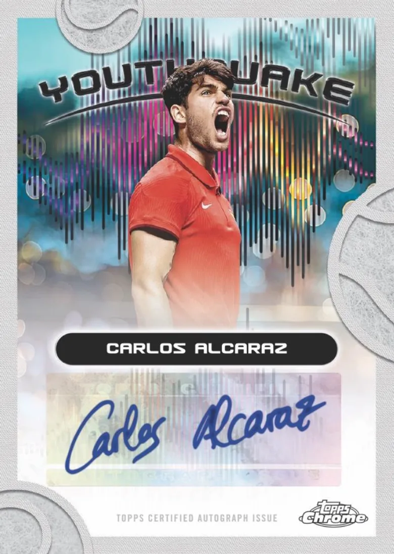 Autographs are a central feature of the 2025 Topps Chrome Tennis Hobby Box, with two Chrome autograph cards guaranteed in every box. The autograph lineup includes Autographs I and Autographs II, as well as the visually distinctive Youthquake Signatures, all featuring on-card Chrome signatures.