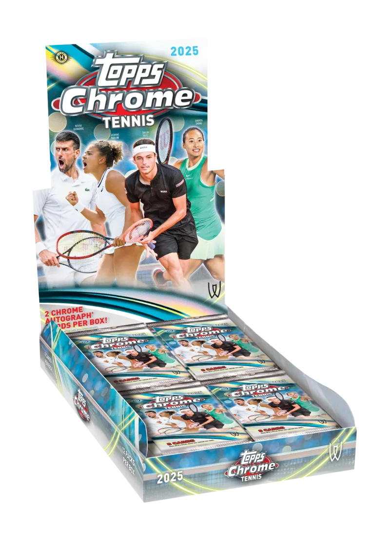 The 2025 Topps Chrome Tennis Hobby Box includes two Chrome autographs, refractor parallels, and short-print inserts. With a global checklist, rookie cards, and limited parallels, the product is built for collectors who value guaranteed hits and Chrome variety.