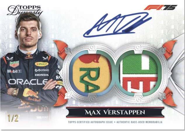 2025 Topps Dynasty F1 boasts several auto and relic-filled subsets, including Dynasty Legendary 75 Patch Autographs, Dynasty Legend Precious Relics, Dynasty Single Driver Dual Relic Autograph Cards, and more.