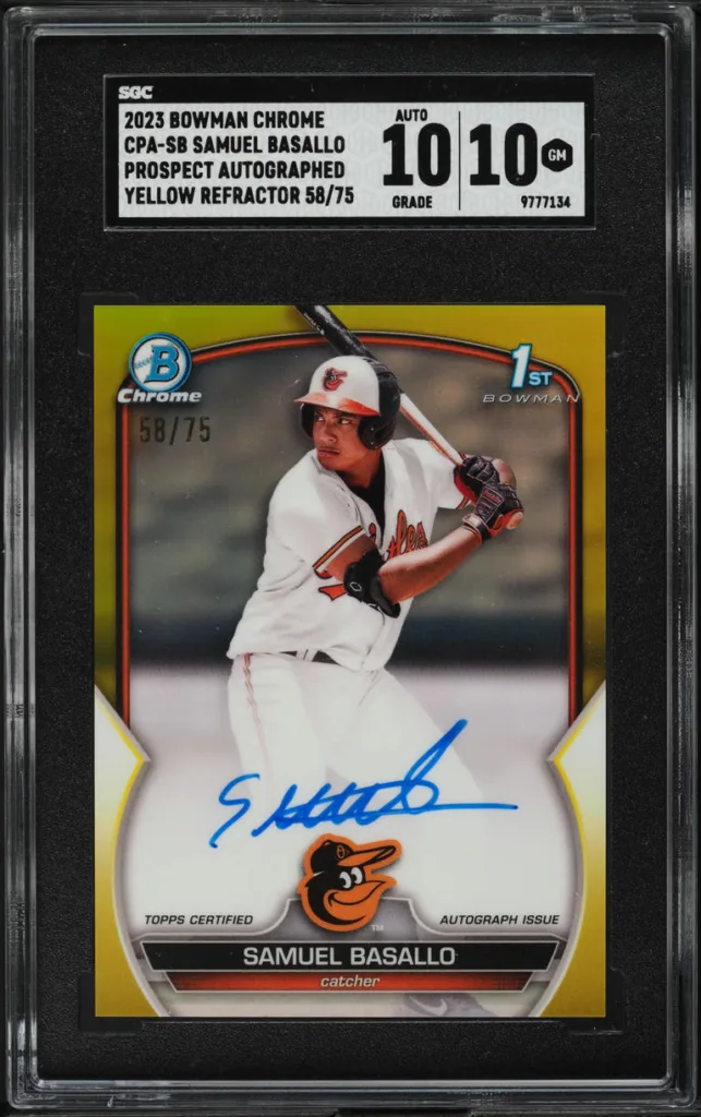 Basallo’s 2023 Bowman Chrome Red Refractor Auto numbered to five sold for over $10,000 in August 2025. His potential, power, and production in the Minors — including a 23 home-run campaign in AAA in only 76 games. More recently, on October 19, 2025, a Gold Refractor Auto version of the card numbered to 50 fetched $2,880 through Fanatics Collect.