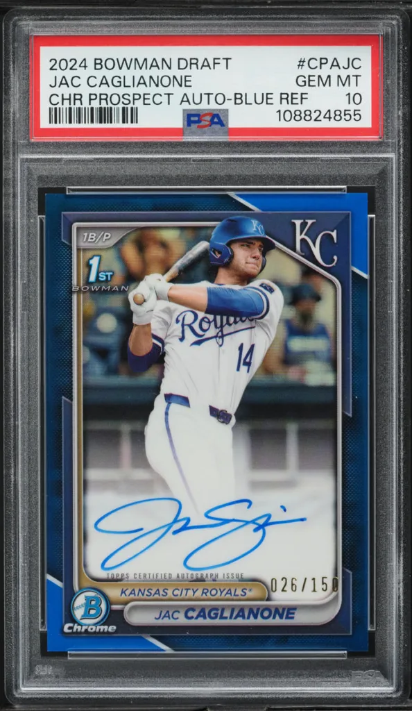 His 2024 Bowman Draft Superfractor Auto sold for $80,000 in March 2025. This brilliant color-matched Blue Refractor is numbered to /150 and is a gem for Royals collectors who are hoping Caglianone’s power profile will transfer to the MLB level.