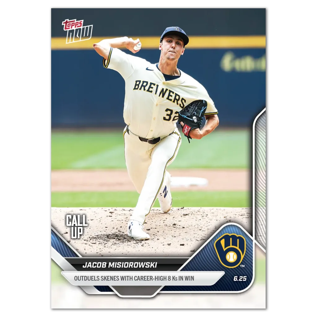 While his first-ever start saw him go five hitless innings in a winning effort, his duel with young superstar Paul Skenes was also one of the greatest moments of the whirlwind start to his MLB career — five scoreless innings to go along with eight strikeouts as he got the win. The Topps NOW card documenting the first (potentially of many) divisional battle between these hurlers saw a print run of over 8,500.