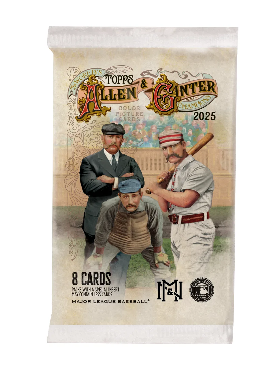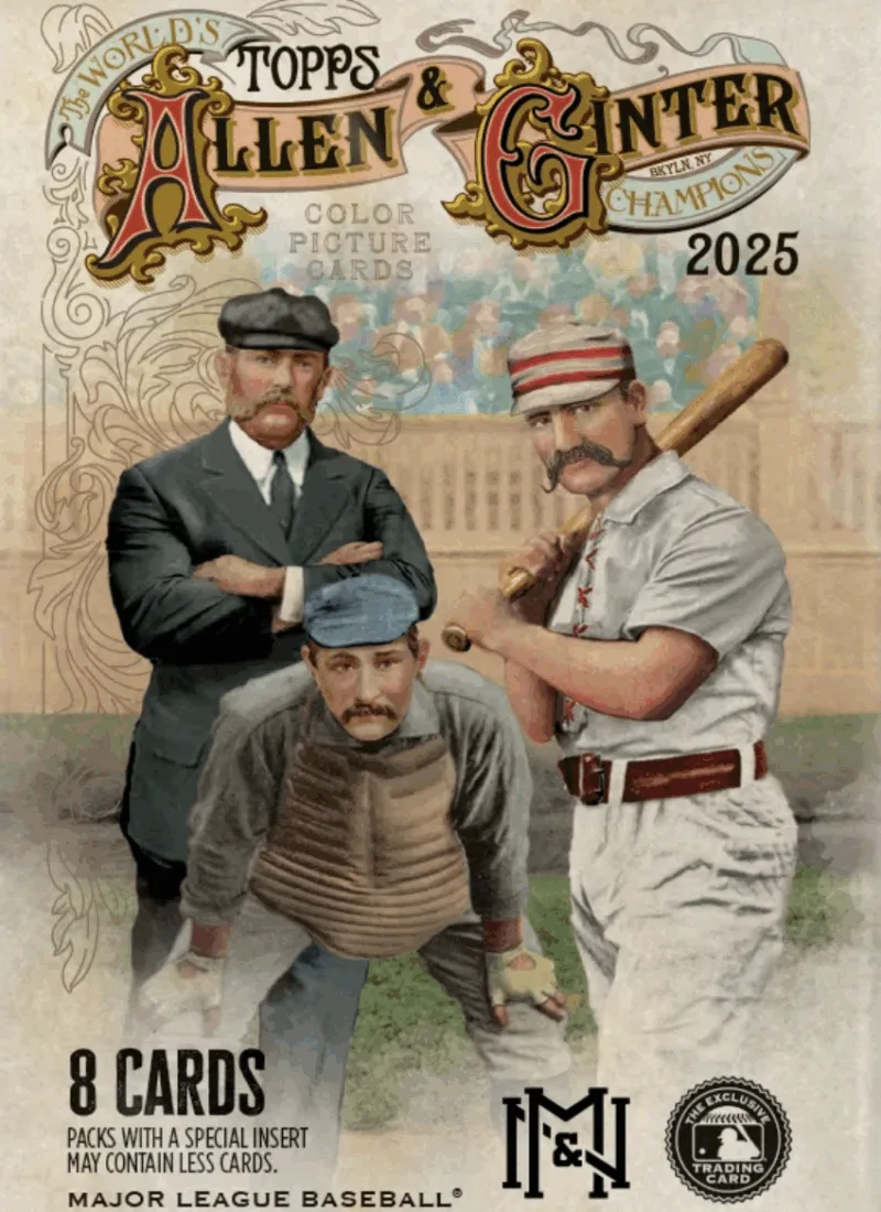The 2025 Topps Allen & Ginter x Mitchell & Ness Exclusive SKU celebrates the brand’s 20th Anniversary with apparel and gift card redemptions, new parallels, and special packaging. Boxes include 18 packs with eight cards each and two hits—autographs or relics.