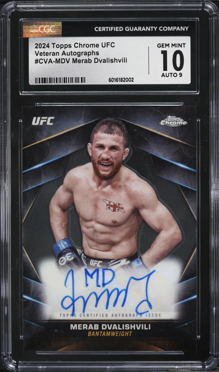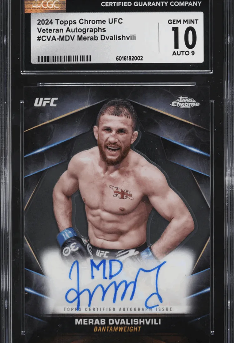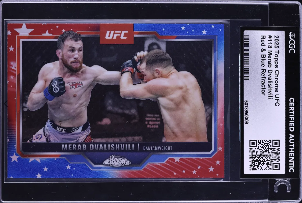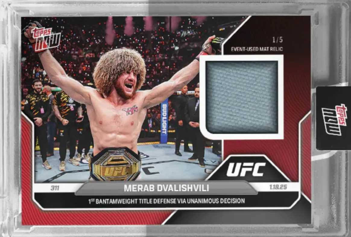 Enter Merab Dvalishvili, who has made a mark as one of the best, boasting one of the longest win streaks in UFC history, and a social media account that’s constantly going viral. This, of course, has generated considerable interest in his Topps cards.