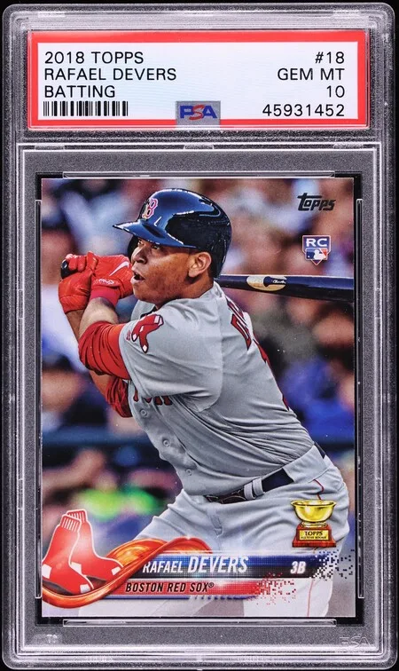 Devers’ RC came out in 2018 Series 1 and includes the prestigious Topps All-Star Rookie Cup. A color-matched Red version numbered to 10 sold for $2,000 in 2023.