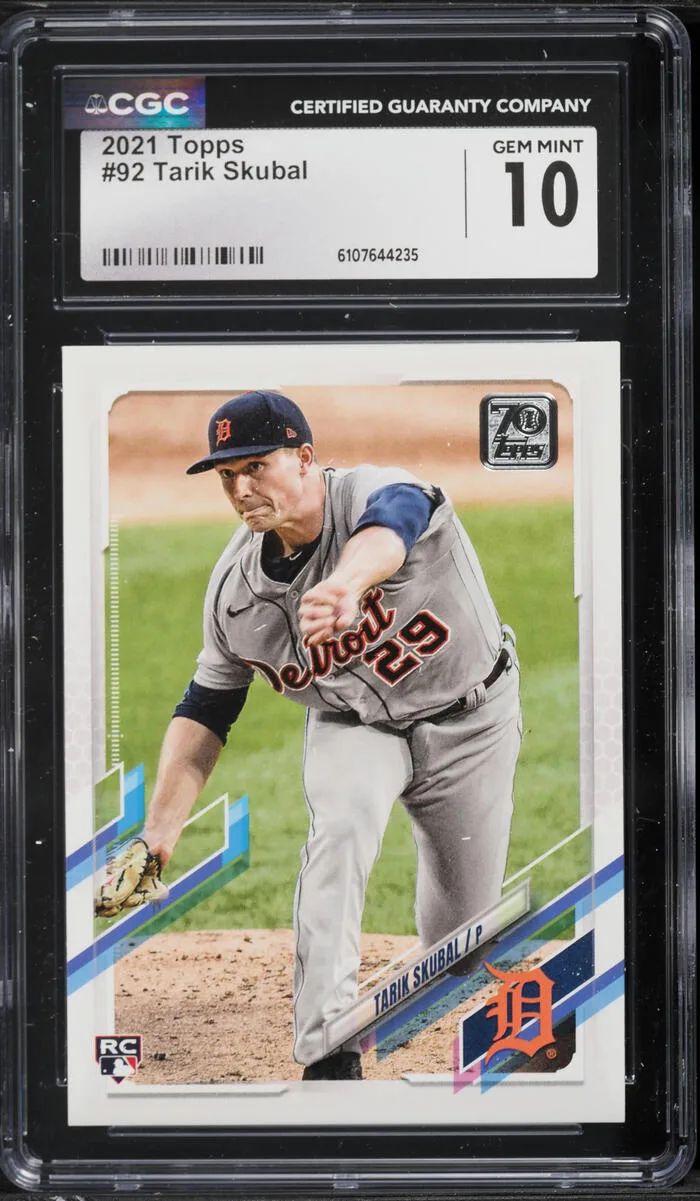 Skubal’s Series 1 RC was released in 2021, with a 70th Anniversary stamp. The 70th Anniversary 1-of-1 sold for $1,250 before Skubal’s historic two-year run even began. More recently, a highly coveted MLB Gold Logoman Dual Auto Patch Card featuring Skubal and NL Cy Young winner Chris Sale sold for almost $22,000 in September 2025.