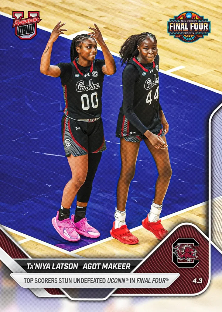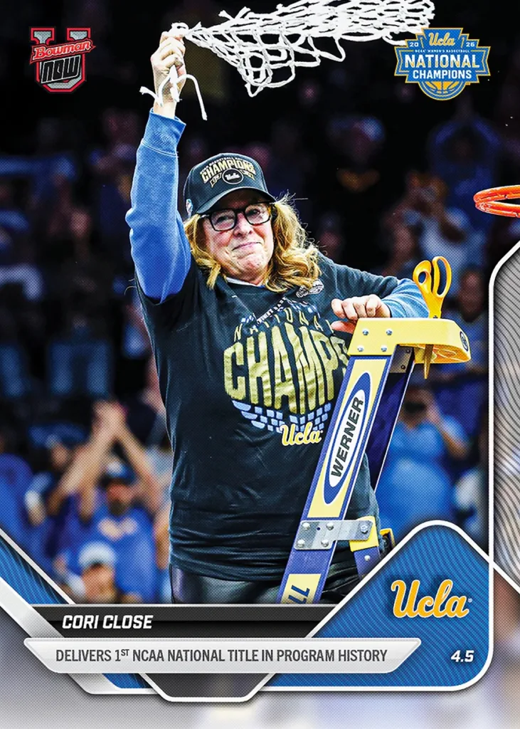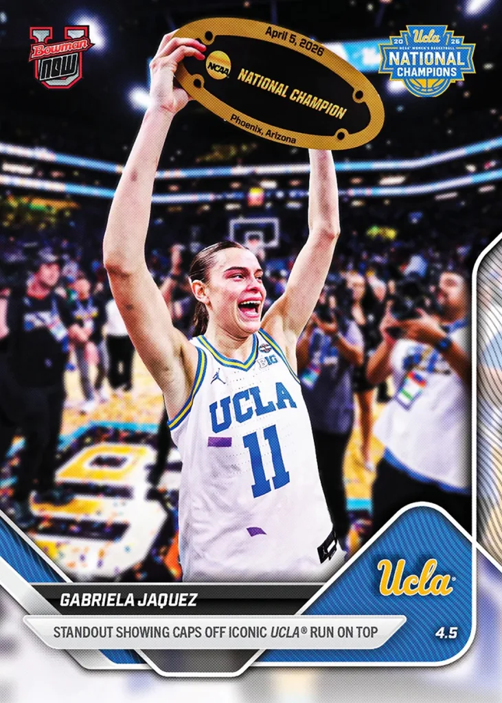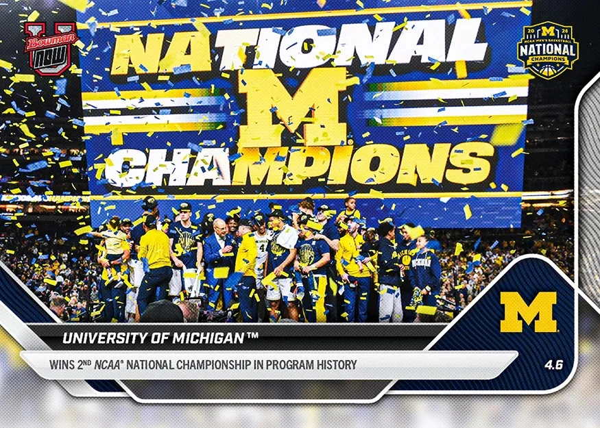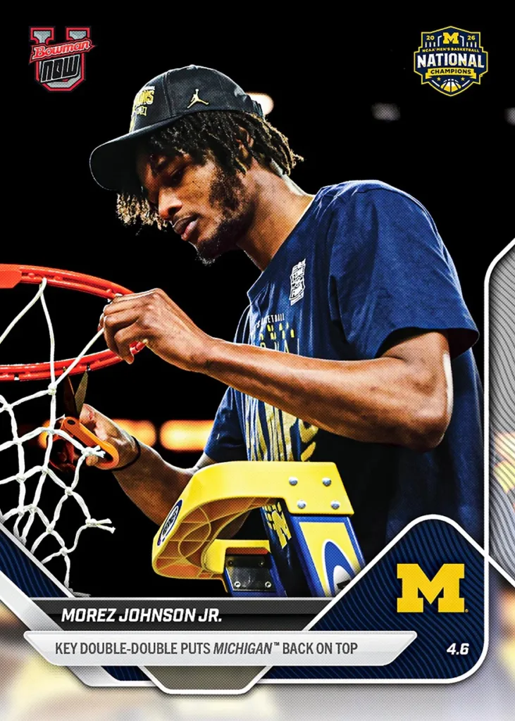 Bowman U NOW Basketball marks the end of the 2026 March Madness tournaments with cards celebrating the national champions on the men’s and women’s’ sides. Collect championship teams Michigan and UCLA, as well as standout stars like Morez Johnson Jr. and Gabriela Jaquez. Cards are available to order for a limited time at Topps.com.