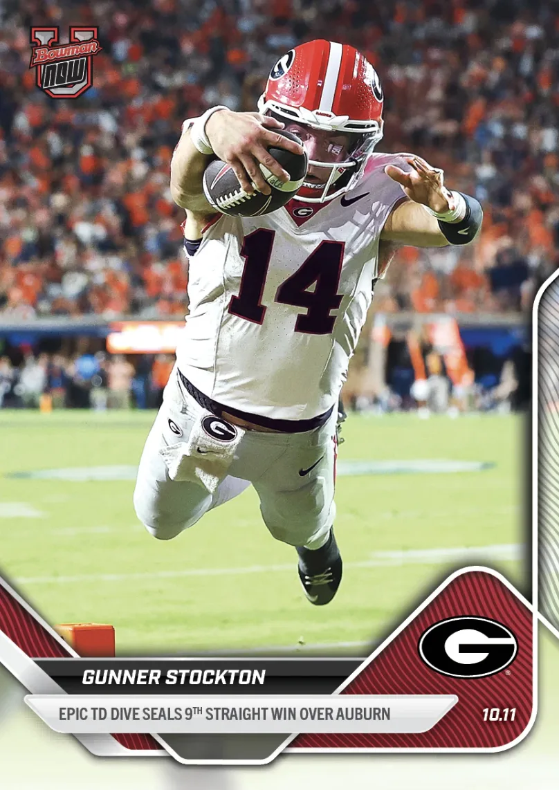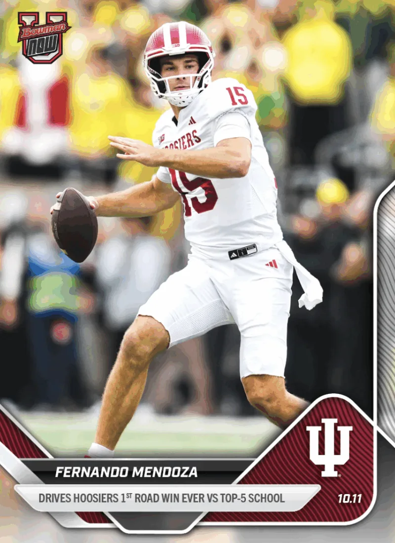 Week 7 of 2025–26 Bowman U NOW® Football features four exclusive online cards: DeAndre Moore Jr., Fernando Mendoza, Gunner Stockton, and Makai Lemon. Vote for your Week 7 Top Player and secure their card during the limited ordering window—your chance to collect timely moments as they happen.