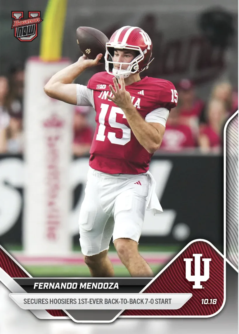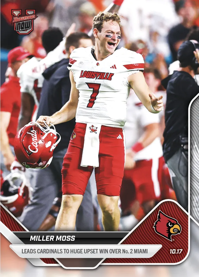 Week 8 of 2025–26 Bowman U NOW® Football features four exclusive online cards: Miller Moss, Fernando Mendoza, Jordyn Tyson, and Diego Pavia. Vote for your Week 8 Top Player and secure their card during the limited ordering window—your chance to collect timely moments as they happen.