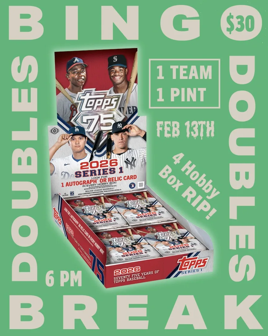 What’s Happening at Doubles: “We’ll be doing an in-person break at the bar for Series 1. These are super fun and very different than most live breaks. It’s a ticketed event and includes a free beer. You get a spin of our bingo cage, and each ball has a team name on it. We pass around packs for everyone to open, beers are flowing, we yell out all the hits. People are trading and making friends. You leave with all the cards we pulled from your bingo team.”