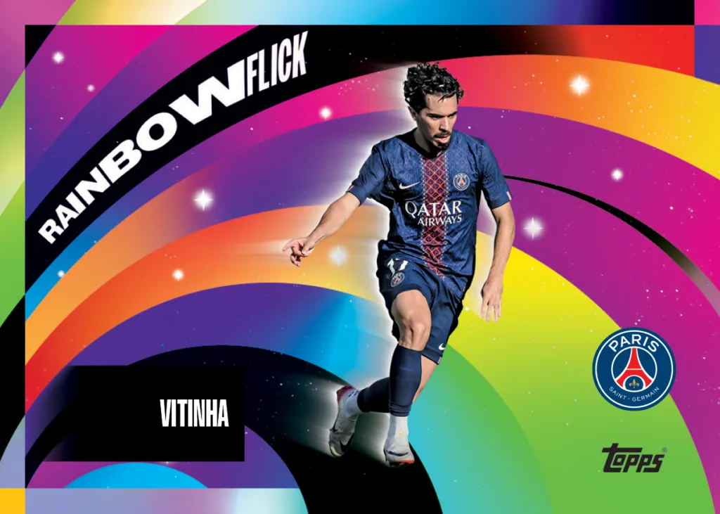 - Rainbow Flick ist ein Case-Hit-Insert mit kräftigem Folien-Design und PSG-Spielern, die für Technik und Kreativität stehen.
