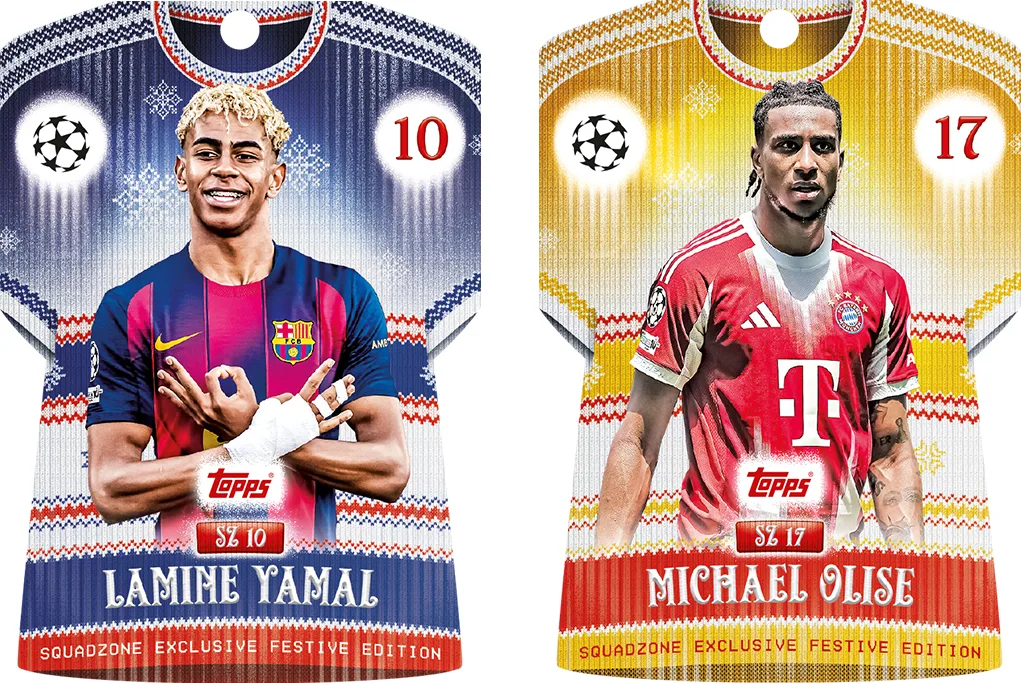 Jede Karte wurde im winterlichen Stil gestaltet – perfekt zum Verschenken oder selbst behalten. Außerdem kannst du mit den besonderen Squadzone Karten sogar deinen Tannenbaum schmücken, z.B. mit Lamine Yamal!