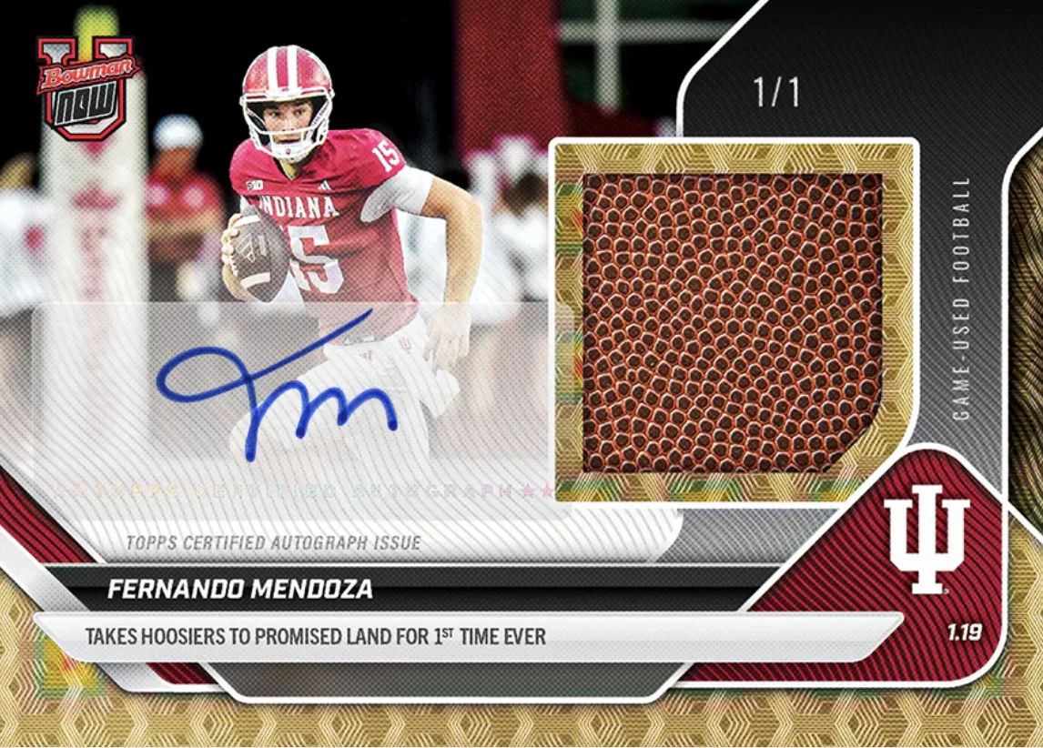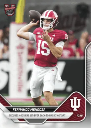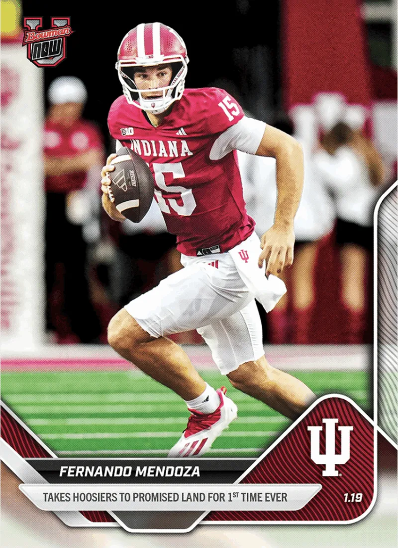 Die Hoosiers krönten diese Saison mit einer perfekten 16–0-Bilanz. Mendozas individuelle Leistungen standen dem historischen Team-Erfolg in nichts nach: Er gewann die Heisman Trophy und wurde zum Offensive MVP des College Football National Championship Games 2026 gewählt. Als Anerkennung für seinen Auftritt auf der größten Bühne des Sports erhielt Mendoza eine 2025–26 Bowman U NOW® Football Karte, die kurz nach dem Titelgewinn veröffentlicht wurde.