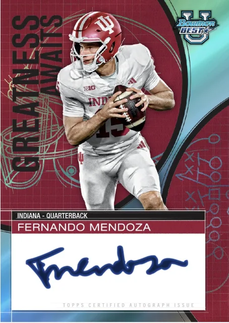 Bowman cards have long been the first place to track the journey of future stars, and Mendoza’s ascent offers a perfect example of how early-year prospecting can pay off. From Bowman U NOW® Football appearances to key inserts and autographs, Mendoza’s cardboard story mirrors his path on the field — full of promise, momentum, and the kind of upside that makes prospecting one of the most exciting parts of collecting.