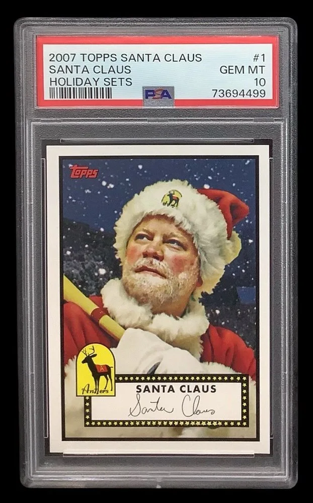 With trading cards becoming an ever-more-popular holiday gift, it was only a matter of time before the holidays and The Hobby came together in set form. Enter the 18-card 2007 Topps Santa Claus set. The cards, which included an auto and a relic (featuring Santa’s suit), featured 10 base cards built off designs of iconic years in Topps.