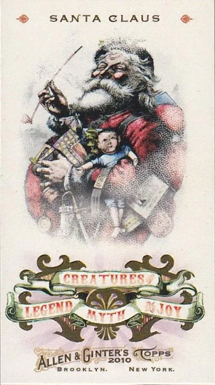 Perhaps the most recognizable is this Mantle-esque Santa Claus card that led off the set, featuring the big man doing his best Mickey, bat across the shoulder and all.