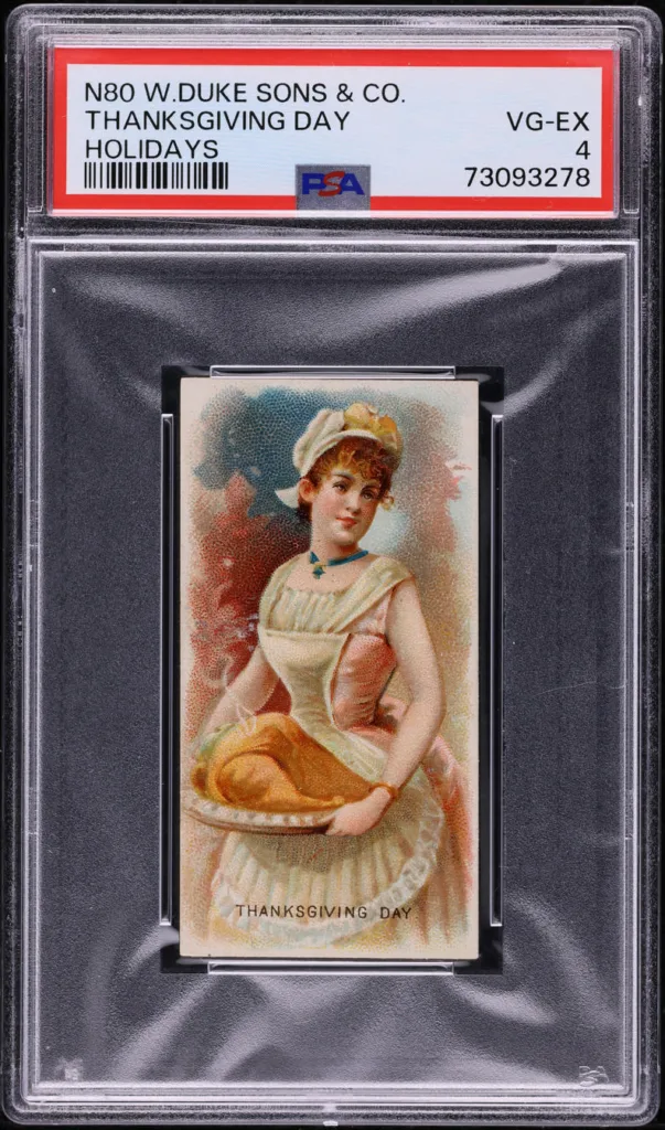 In the late 1800s, Duke was a major player in the tobacco card world. The 1890 N80 Duke Holidays release was a 50-card set that was not specific to the festive season, but rather was designed to celebrate a variety of holidays from around the world. These included the Fourth of July, George Washington’s birthday, the French Grand Prix horse race, and of course, Thanksgiving and Christmas.