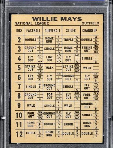 The card back has no player information, just the game. Each possible combination of dice numbers has an outcome that changes based on one of four pitches the opponent selects. For example, on the Mays card, a dice roll of five is a strikeout if a fastball or slider is selected by the opponent, but a walk if it’s a slider or changeup.
