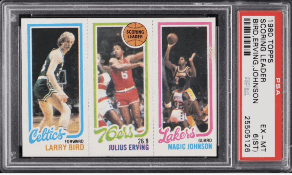 In addition to an array of solo cards, this historic triple card featuring Dr. J alongside rookie rivals Larry Bird and Magic Johnson has become one of the best Topps cards in the basketball Hobby, selling for as much as $840,000.