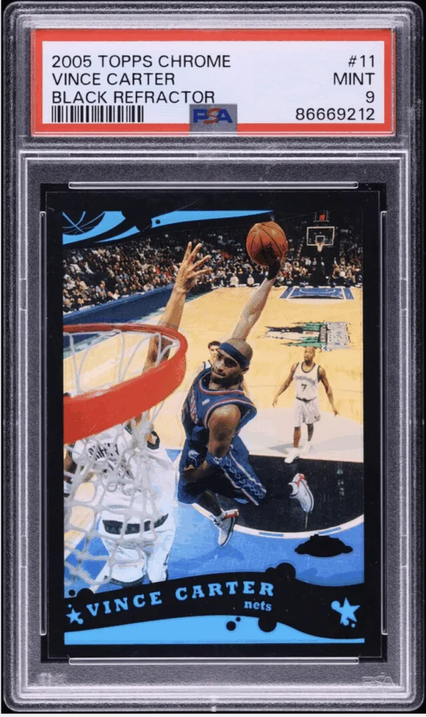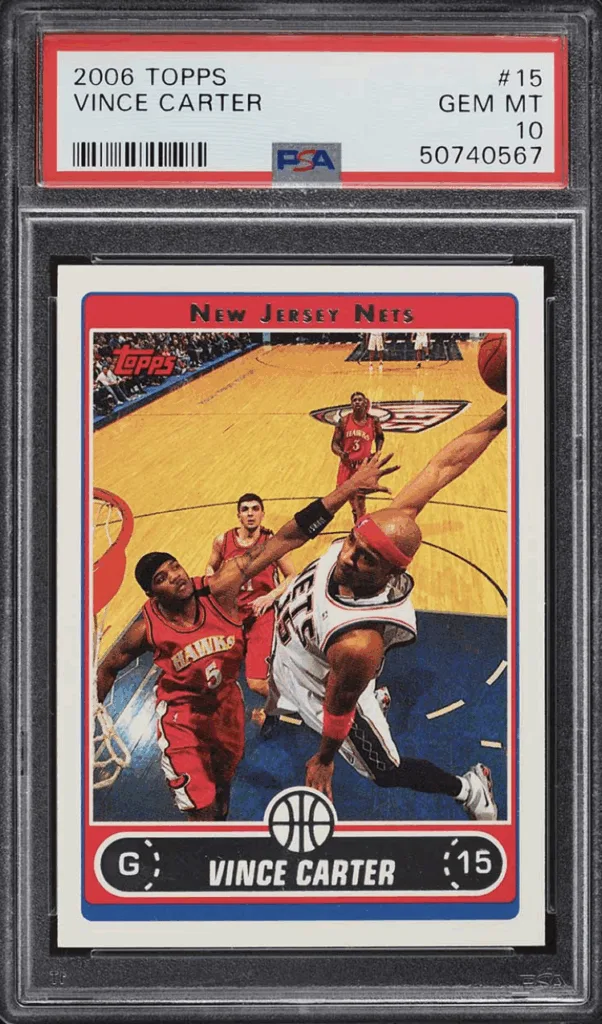 Carter’s most valuable Topps cards come from his time with the Raptors, but there are some great options from his stay in New Jersey, including this poster of a card showing Vince throwing down a trademark dunk.
