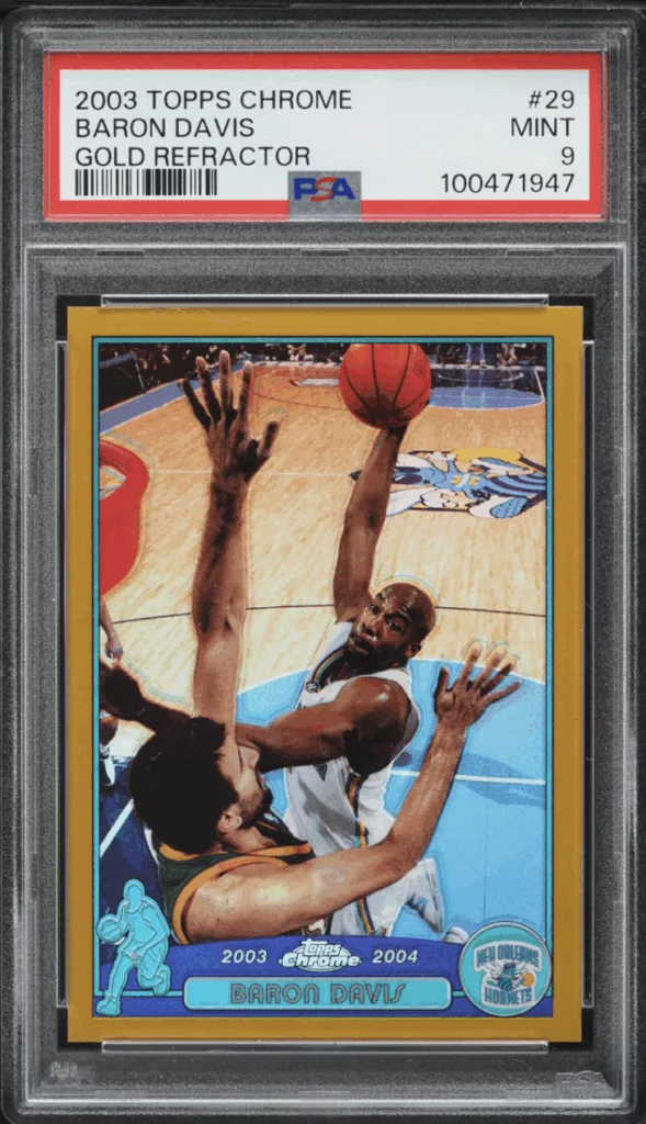 In addition to rookie cards from his start in Charlotte, Baron Davis cards from his time in the Big Easy are also there to be chased, including this offering from 2003 Topps Chrome Basketball, one of the best basketball sets of all-time, which featured, among others, LeBron James, Dwyane Wade, and Carmelo Anthony RCs.