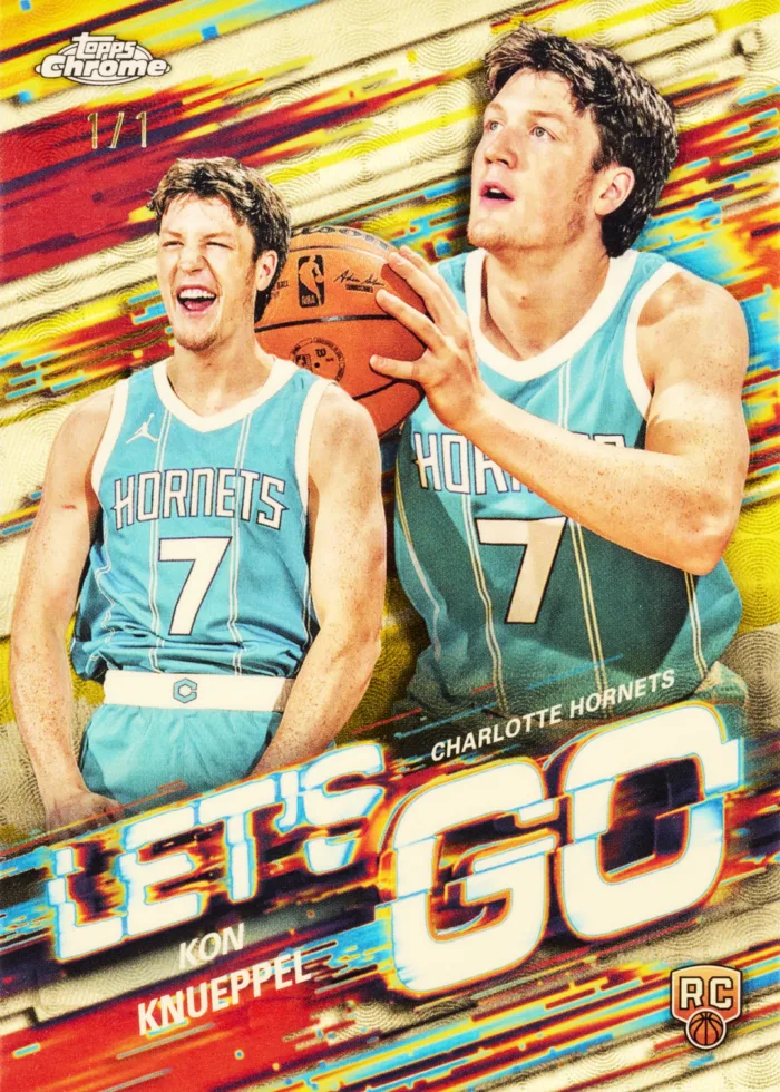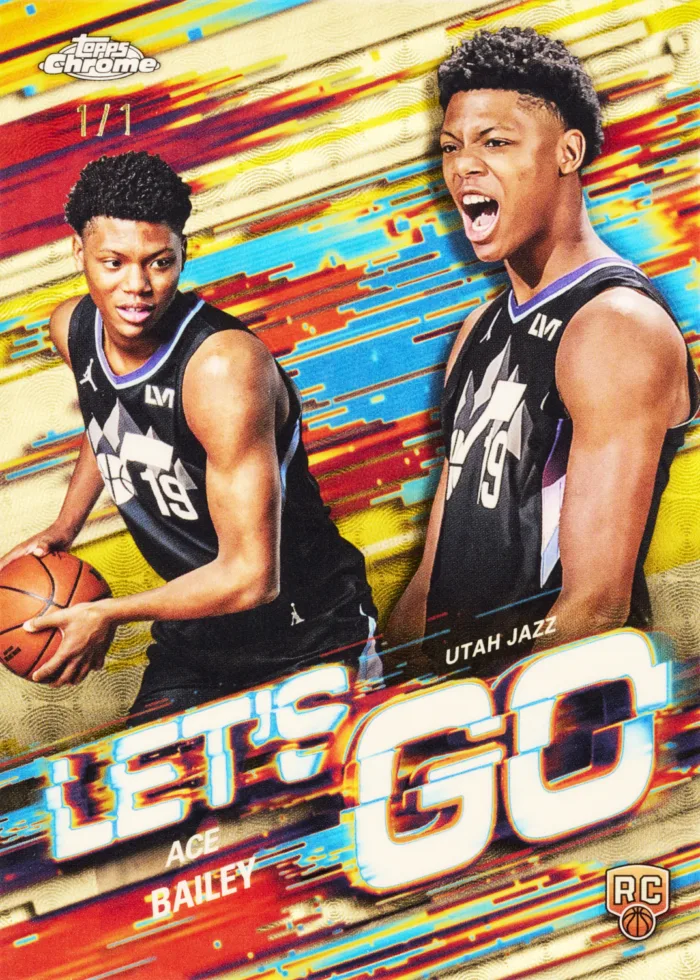 LETS’ GO! is a stunning SSP insert that runs the gamut from superstars like LeBron James and Steph Curry, to rising stars like Paolo Banchero and Cade Cunningham, to rookies like Cooper Flagg and Dylan Harper.