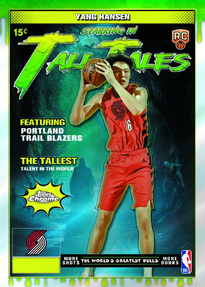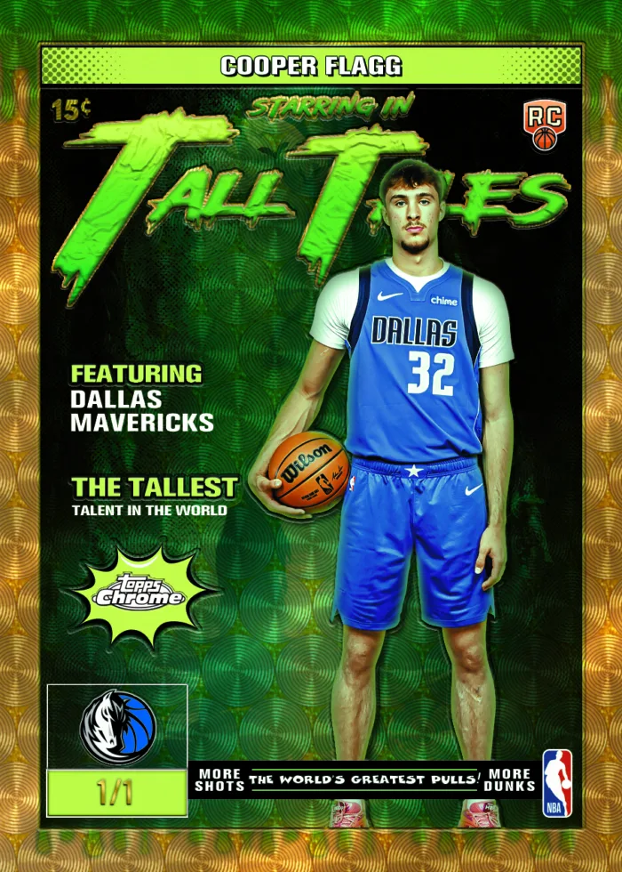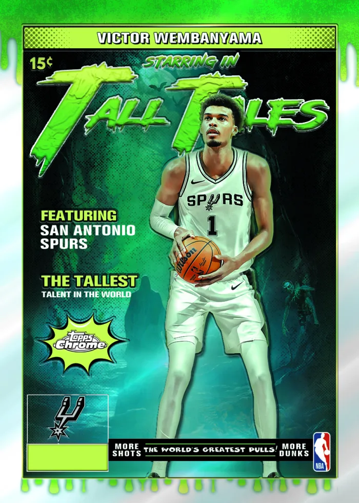 Combining multiple collectible themes, 2025-26 Topps Chrome Basketball Tall Tales frames the NBA’s best and brightest with a vintage comic book look. This 25-card insert showcases superheroes like Victor Wembanyama and Cooper Flagg.