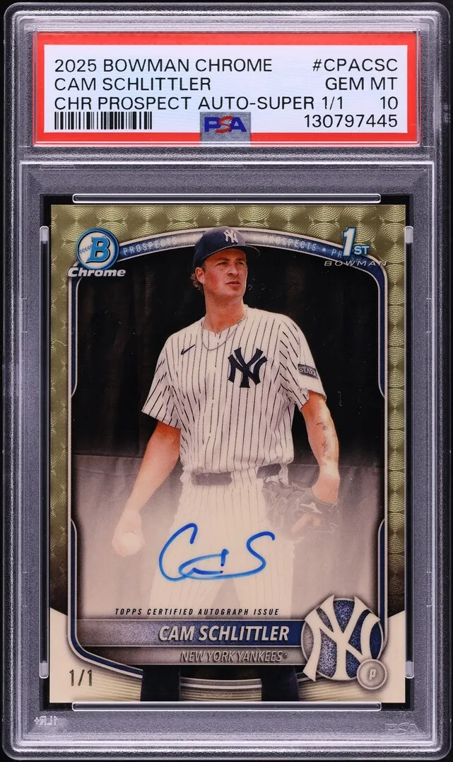 2025 Bowman Chrome Baseball Chrome Prospect Autographs #CPACSC Cam Schlittler 1st Bowman Auto Superfractor 1/1