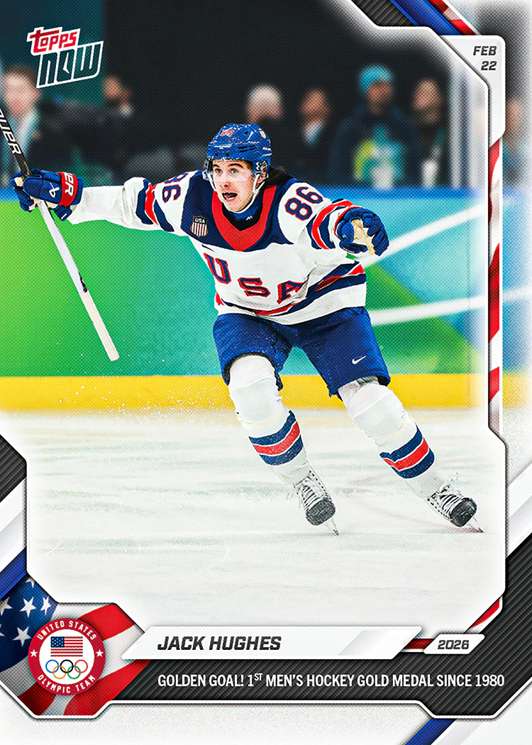 Jack Hughes delivered one of the defining moments of the 2026 Winter Olympics. His gold medal overtime goal for Team USA instantly became one of the most popular Topps NOW® cards ever released. Topps captured the moment in 2026 Olympics Topps NOW Card #18. The card finished with a print run of 332,447, placing it among the highest ordered Topps NOW releases in program history.