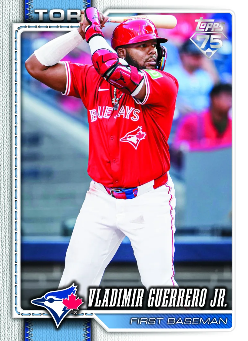 刷新されたビジュアルに加え、ベースカードには節目を示す小さなサインも組み込まれている。「毎年完全に新しいデザインにすることに加え、Series 1の75周年を記念してTopps 75thロゴを加えた」。シュワルツはそう語る。そのロゴは主張しすぎることなく、あくまで静かに、この年の特別さを伝えている。