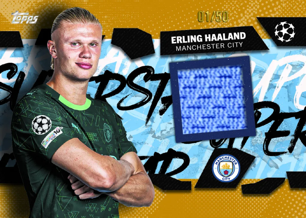 TOPPS SUPERSTAR RELICS では、ハーランド、ムシアラ、ベリンガム、サラーなど現役スター62選手がラインナップされ、世界のトップレベルで戦う選手たちの存在感をカードとして手元に残すことができる。